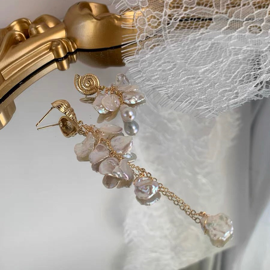 keshi éclats d'argent perles baroques naturelles en forme de pétale coquillage conque aiguille en argent 925 boucles d'oreilles romantiques françaises de niche nouvelles