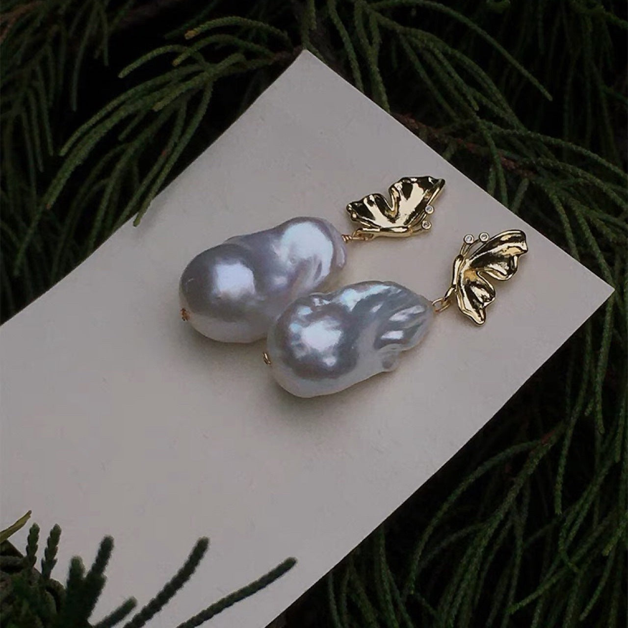 自然系蝴蝶超大鱼尾大巴洛克天然异形珍珠耳环耳坠耳饰不规则银针