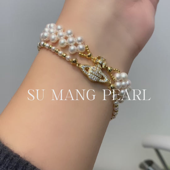 Le choix d'associer des perles de différentes tailles à des perles dorées s'explique par le fait qu'un simple collier de perles serait trop monotone, tandis qu'un empilement de plusieurs rangs risquerait de surcharger l'ensemble. Cette combinaison de perles et de perles dorées préserve la délicatesse des perles tout en créant une hiérarchie visuelle grâce aux perles dorées, conférant au bracelet un aspect minimaliste mais raffiné.
